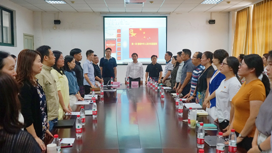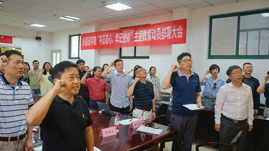 主题教育动员大会在雄壮的国歌声中拉开序幕,接下来,党委副书记伍施乐领誓,全体党员面向党旗,重温入党誓词,在党旗下全体党员重温了自己对党忠诚的铮铮誓言,表达了“不忘初心、牢记使命”的信念和决心。
