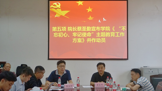会上,院党委书记余启军结合学院实际,对开展主题教育进行了深入动员。余启军传达学校《 “不忘初心、牢记使命”主题教育工作方案》和栾永玉书记主题教育动员讲话精神并作部署。一是按照学校统一部署,学院“不忘初心、牢记使命”主题教育从9月开始,至11月底基本结束。主题教育不划阶段、不分环节,把学习教育、调查研究、检视问题、整改落实贯穿全过程。二是要切实提高政治站位,深刻认识开展主题教育的重大意义。栾书记强调,开展好“不忘初心、牢记使命”主题教育是当前我校重大而紧迫的政治任务,也是推进学校改革发展的重大机遇。我们需要充分认识到,开展主题教育是进一步加强党的建设、是进一步统一思想、进一步提升能力,众志成城解决学院面临的突出问题的迫切需要。三是要牢牢把握总要求,把主题教育的落脚点放在实字上,狠抓落实开展好本次主题教育。四是要做实重点措施,把高标准、高质量贯穿主题教育全过程。五是要加强组织领导,确保主题教育出实效。余启军强调,要压紧压实责任,要防止形式主义,对不符合学校要求、工作不力的将及时指出纠正,要重视宣传引导工作,在全院范围内掀起开展主题教育的热潮。余启军号召,全院上下要提高政治站位,以主题教育为契机,进一步增强“四个意识”、坚定“四个自信”、做到“两个维护”,进一步增强立德树人的责任感与使命感,以自我革命精神、从严从实作风、科学有效方法抓好主题教育,不忘初心再出发,牢记使命勇担当,凝心聚力促发展,以优异成绩向新中国成立70周年和中国共产党成立100周年献礼。