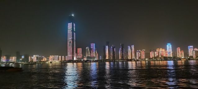 晚饭后,老师们乘车赶往粤汉码头乘坐游轮感受汉口江滩夜景。游轮往返于长江二桥和鹦鹉洲长江大桥之间,串起了汉口江滩、江汉关钟楼、龟山、黄鹤楼等武汉地标景点。在船上,江风灵动,充分感受到长江宽阔的胸怀和长江灯光秀的光影魅力。“两江四堤八林带,火树银花不夜天”,这是一位诗人对武汉江滩美景的赞颂。在武汉三镇的水景中,武汉江滩可谓是这座滨江城市中一道最美丽的风景。吹着江风,在视野开阔的油船甲板区域,全程将绚烂夜景尽收眼底。