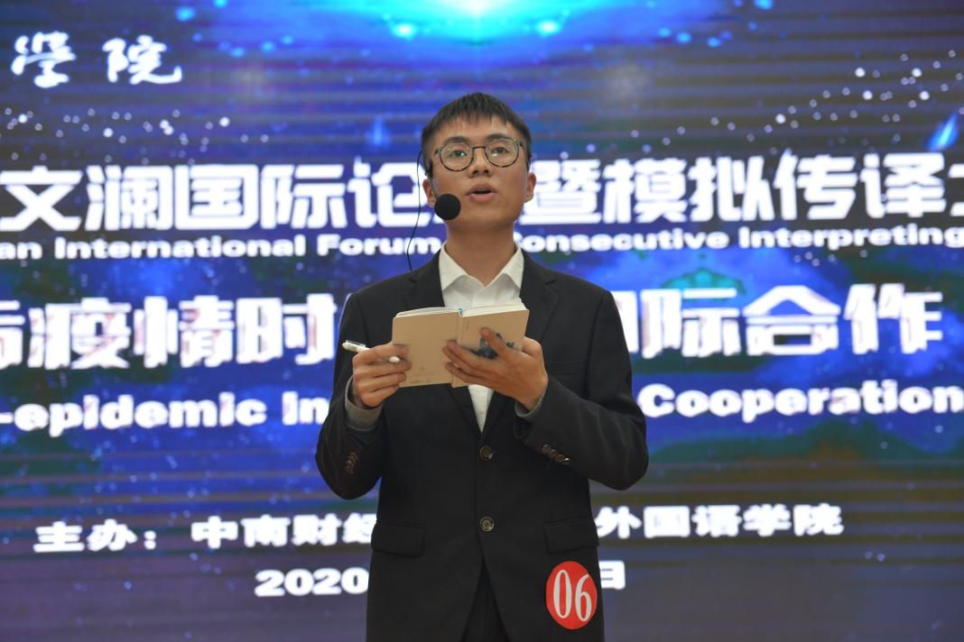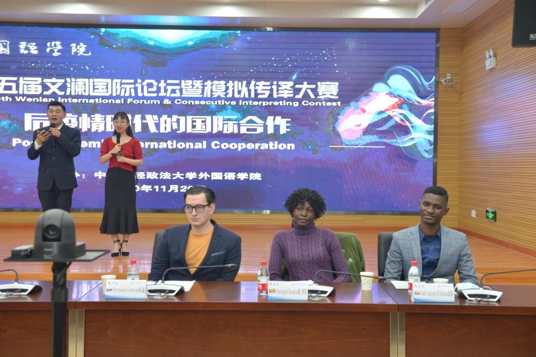 在本次大赛第一环节中,自美国、俄罗斯、乌干达、厄立特里亚、贝宁的来华留学生和js33333金沙线路检测的青年教师们使用英语、法语、俄语、日语和汉语就“后疫情时代的国际合作”这一话题做了主旨发言,同议热点话题,共话国际担当。十位参赛选手为他们进行交替传译。