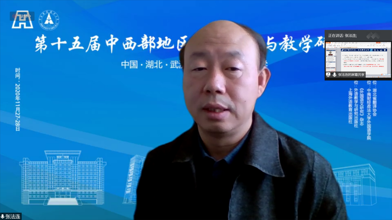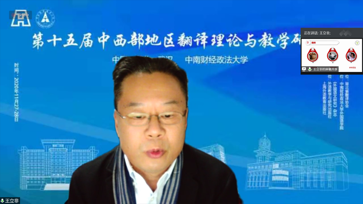 张法连教授以“‘依法'翻译才能让中国故事传播久远”为题做出了发言,张教授指出了发扬法律翻译精神的重要性,译质量,提升传播效率。新媒体时代,翻译乱象丛生。只有依“法”翻译,才能让中国故事传播得更久远。在当今的翻译的研究和教学工作中,法治精神不容忽视,应改进翻译质量,杜绝胡译乱译,对待翻译要树立法律责任感,牢牢把握习近平法治思想,苦练内功,目标精准;把握内涵,站稳立场。张教授的发言于规范中统一,表述严谨,响应了时代的号召。