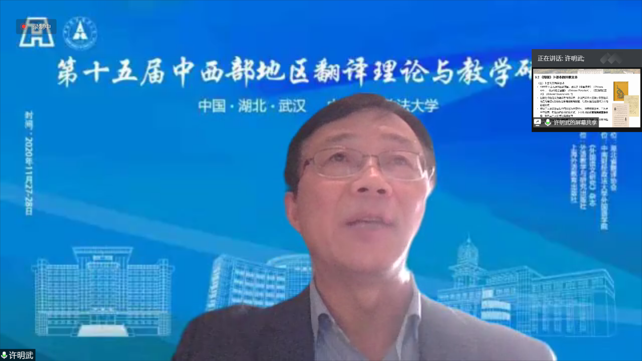 许钧教授基于多年的翻译研究和实践经验,就“关于翻译和翻译研究的几点思考”的题目进行了发言。他从疫情引入,深刻讨论了翻译人的社会使命,历史使命。他指出,我国翻译事业发展与国家发展相合,在当前文化交流的大背景下,对于中国对外话语体系的构建、中国对外的文化传播意义重大,并强调了翻译在外语教学、国家科研事业中的独特作用,使大家对翻译和翻译研究的发展有了更深刻的认识。主持人华中科技大学博士生导师黄勤教授对讲座给予了高度的评价。