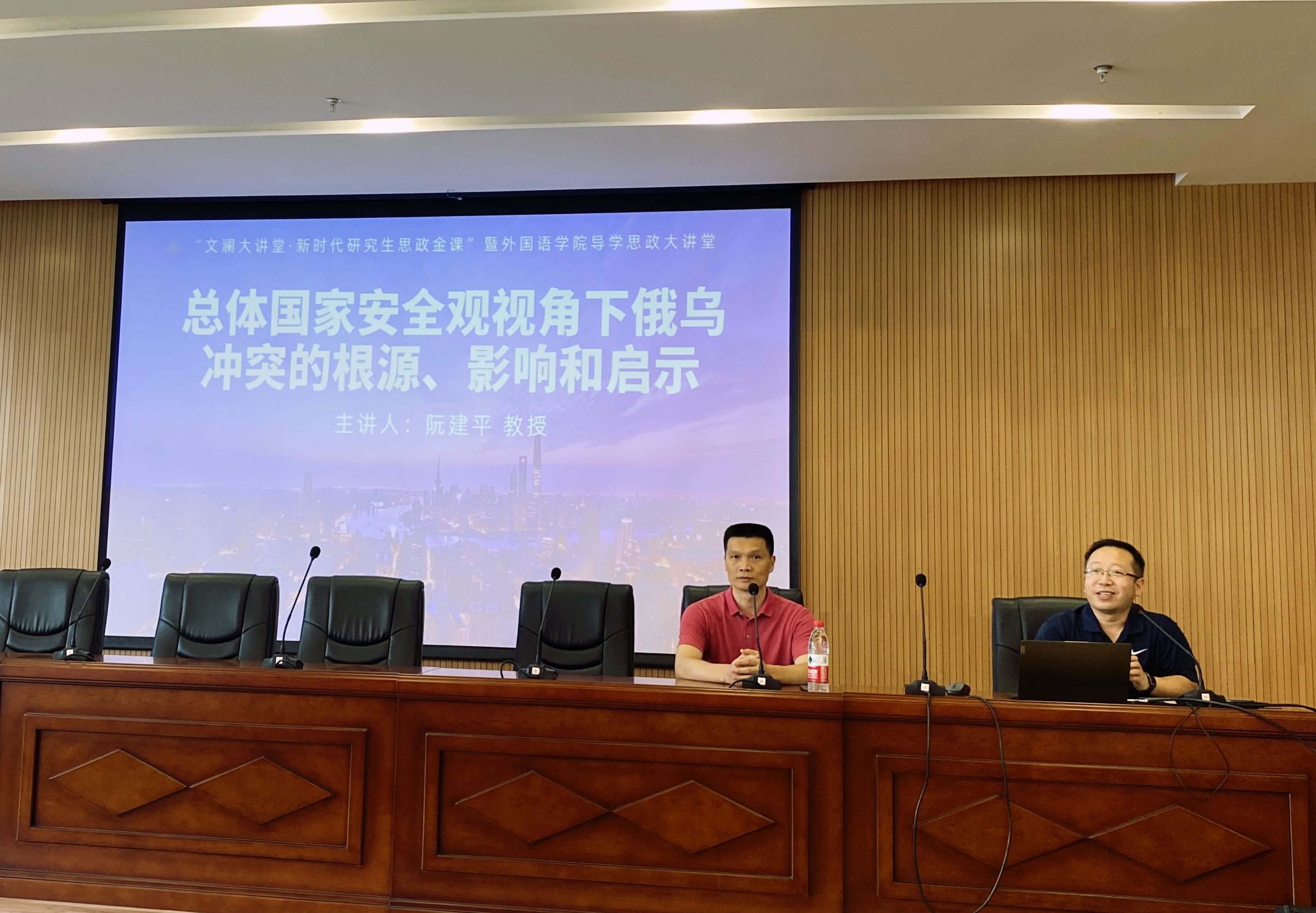 (通讯员:范楷昕)6月16日下午14:30,导学思政大讲堂第六期“总体国家安全观视角下俄乌冲突的根源、影响和启示”在文澴南附楼101开讲。本次讲座由武汉大学政治与公共管理学院副院长、国际关系专家阮建平教授主讲,js33333金沙线路检测副院长阮全友教授主持,副院长胡惮、党委副书记余向阳、党委副书记王芹、院长助理孙世权,以及相关教师出席,近百名师生参与讲座。