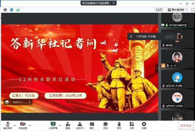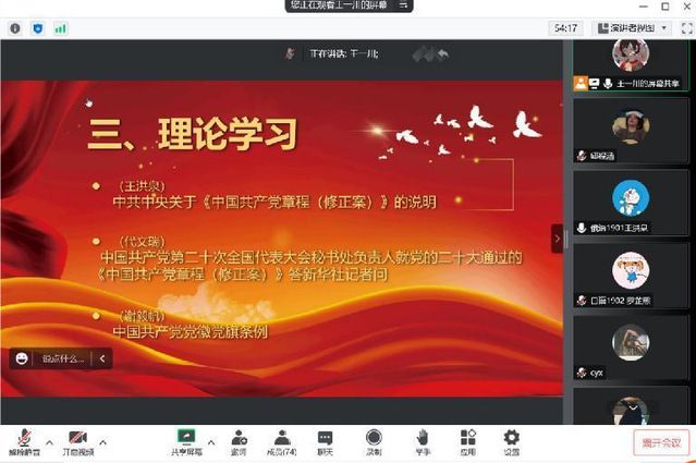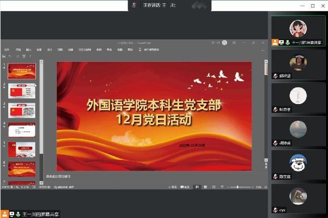 院网讯(通讯员邱裎涵)12月29日下午15:00,学院本科生党支部于腾讯会议开展以“学习践行新党章,学深悟透二十大”为主题的党日活动,支部全体党员参与活动,活动由2020级预备党员王一川同志主持。