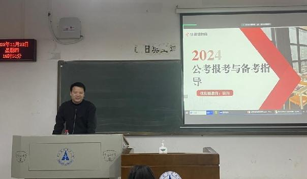 院网讯(魏露露 宋佳仪)为进一步指导学生做好职业规划,明确职业发展目标,11月23日晚,学院于文澜楼307举办考公考研考编形势分析与指导讲座。本次讲座邀请万学教育海文考研湖北分校校长谭晓禹,优仕德教育创始人王亚,优仕德教育考公负责人饶翔担任主讲人。2021级及2022级本科生参加活动,活动由本科生辅导员李怡奕主持。
