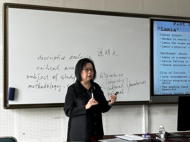 讲座伊始,蔡院长热情而隆重地介绍了叶教授的学术经历和丰硕成果。在讲座中,叶教授从不同批评理论及视角出发,全面探讨了约翰·济慈的长篇叙事诗《拉弥亚》的主题构建、形式架构、历史语境、道德伦理意蕴、原型意义、深层心理结构、宗教及文化内涵。首先,通过对比拉弥亚与赫尔墨斯的形象,揭示了超自然与人类爱情追求之间的张力。叶教授特别倡议对《拉弥亚》和冯梦龙的《白娘子永镇雷峰塔》展开比较研究,提示两篇相似“情境”的文本在内容和文化上的异同。随后,叶教授引领我们回溯至希腊神话,全方位解读《拉弥亚》。阐释拉弥亚半人半蛇的悲剧起源及其疯狂行径。